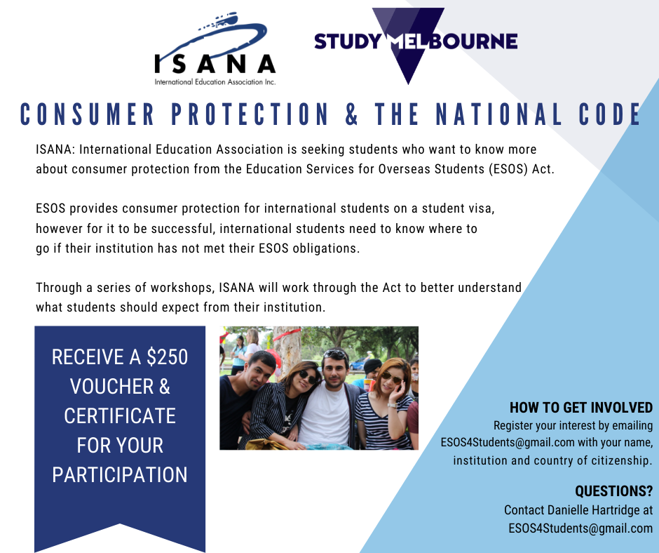 ISANA is seeking students who want to learn about consumer protection in the Education Services for Overseas Students (ESOS) Act.
